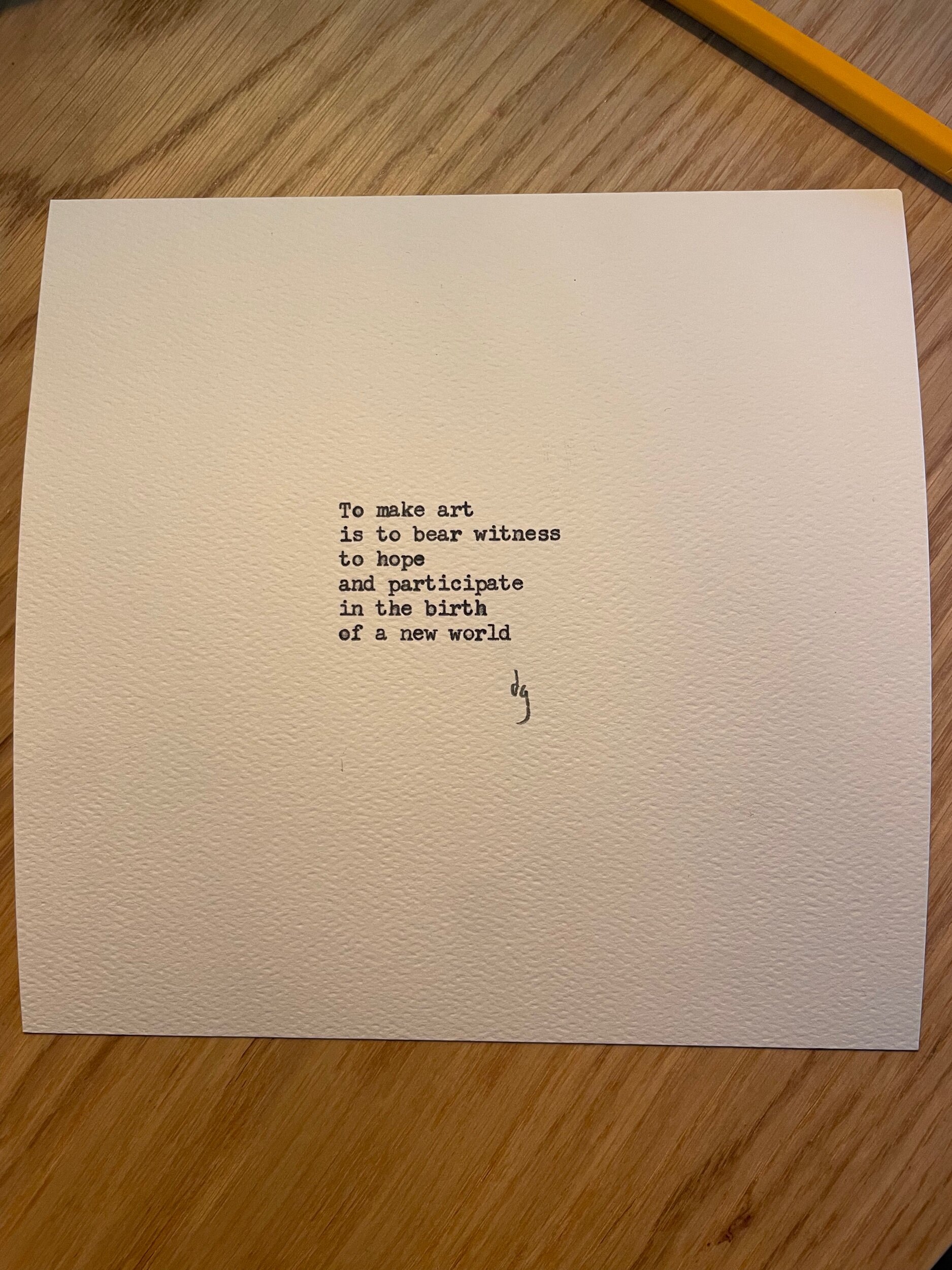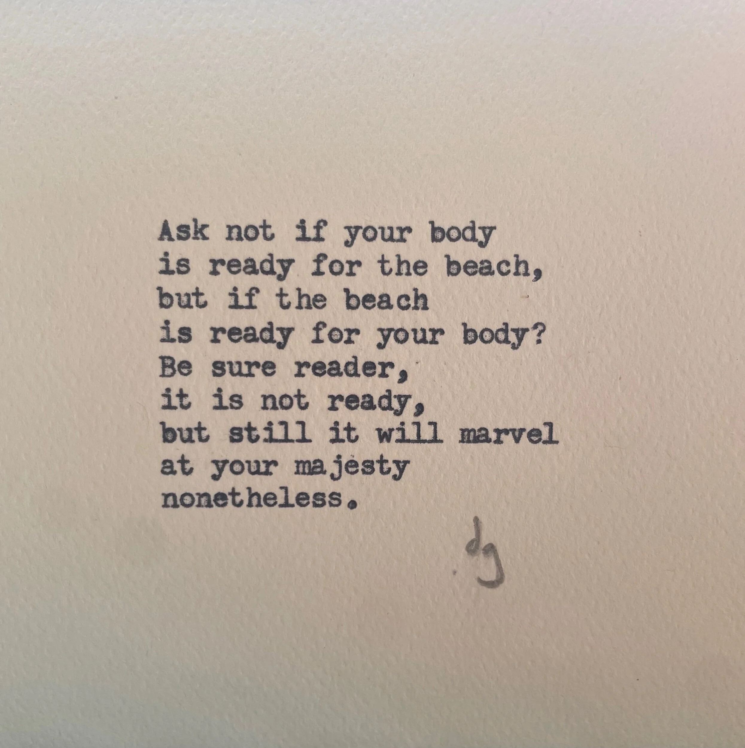 HAND TYPED POEMS & MORE WELCOME TO A REBELLION OF CAREHand-typed poems, prints, stickers and a book Store Clear Filters Filter Clear Filter JOY IS AN ACT OF REBELLION - 4.25 x 1.38” from $3.00 LIKE EVERY SELFIE - full color 8x10” Sale Price: $16.00 Original Price: $20.00 Sale A Non-Apology $20.00 UNREST $15.00 Tell Me About Your Person - Poster Sale Price: $16.00 Original Price: $18.00 Sale THERE ARE SOME SORROWS - 8x10” Sale Price: $16.00 Original Price: $18.00 Sale MUTUAL SANCTUARY - 8x10” Sale Price: $16.00 Original Price: $18.00 Sale I Am Not Your Cup Of Tea - PRINT Sale Price: $16.00 Original Price: $20.00 Sale Friendship Will Save Us - 8x10 poster Sale Price: $16.00 Original Price: $18.00 Sale PRIESTHOOD - 8x10” Sale Price: $16.00 Original Price: $18.00 Sold out A Rebellion of Care - Poems & Essays $18.99 SIGNED COPY - A Rebellion of Care $22.99 I AM NOT YOUR CUP OF TEA - 8x10” Sale Price: $16.00 Original Price: $18.00 Sale Stay Weird - POSTER - 8x10” Sale Price: $16.00 Original Price: $18.00 Sale Hope is Nocturnal - 8x10” Sale Price: $16.00 Original Price: $18.00 Sale LIKE EVERY SELFIE - Poster Sale Price: $16.00 Original Price: $18.00 Sale WASTE YOUR LIFE 8x10” Sale Price: $16.00 Original Price: $18.00 Sale HOW TO EXPLORE A CITY - 8x10” Sale Price: $16.00 Original Price: $18.00 Sale I Still Get To Be Yours - 8x10” Sale Price: $18.00 Original Price: $20.00 Sale The Real Ones - 8x10” Print Sale Price: $16.00 Original Price: $18.00 Sale Prisms - 8x10” poster Sale Price: $16.00 Original Price: $18.00 Sale Less Panic, More Disco - POSTER 8"X10" Sale Price: $16.00 Original Price: $18.00 Sale NOSTALGIA - Print $12.00 Demonade - Ink print $10.00 Joy is an Act of Rebellion Sticker - BLUE from $4.00 A Lessening - only 100 copies $22.00 Simple Rules For Living Well #5 $15.00 Bittersweet $18.00 Joy is an Act of Rebellion - 8x10” Sale Price: $16.00 Original Price: $18.00 Sale Joy is an Act of Rebellion - STICKER from $4.00 Joy is an Act of Rebellion - Christmas Card from $2.50 Priesthood $20.00 I Am Not Your Cup Of Tea $22.00 Friendship Will Save Us $25.00 Joy Is An Act of Rebellion $25.00 CICADAS $20.00 Practice Resurrection $18.00 The Fruit Of Humility $12.00 Renaissance $20.00 Dear houseplant Sale Price: $15.00 Original Price: $18.00 Sale Simple Rules # 3 - HAND PRINT $10.00 SIMPLE RULES #1 - INK PRINT $12.00 Simple Rule For Living Well #4 $15.00 STARDUST - 8x10” color poster Sale Price: $16.00 Original Price: $20.00 Sale Birdsong - 8x10” print Sale Price: $18.00 Original Price: $20.00 Sale Shop Local Sticker from $4.00 Simple Rules For Living Well #3 $18.00 If you want to change the world Sale Price: $15.00 Original Price: $20.00 Sale Ritual Of Care - Bumper Sticker from $4.00 Such A Pussy $20.00 Speak Freely Sale Price: $15.00 Original Price: $20.00 Sale I Still Get To Be Yours $25.00 Simple Rules For Living Well #1 $18.00 Enneagram Poem Postcards from $2.50 Spontaneous Melodic Rapture - Bumper Sticker from $2.50 Sale Art is Vast $18.00 IT IS WHAT IT IS Sale Price: $15.00 Original Price: $20.00 Sale Mutual Sanctuary $22.00 The Chasm Between Nice & Kind Sale Price: $15.00 Original Price: $18.00 Sale LIBERATE AGITATE PROPAGATE $10.00 The Kind of Dreamer $35.00 That Summer Feeling $25.00 A QUIET LIFE - Ink Print $12.00 HEATWAVE - 8x10” print Sale Price: $16.00 Original Price: $18.00 Sale Love The One In Front Of You $25.00 A List Of Spiritual Disciplines $22.00 Staying In Shape $22.00 VERSION from $10.00 They/Them $20.00 Check In On Your Strong Friends Sale Price: $25.00 Original Price: $28.00 Sale The Real Ones $22.00 Waste Your Life $25.00 Stardust $18.00 Hope Is Nocturnal - Bird Poster from $14.00 Sale Birdsong - Bird Poster from $14.00 Sale Does A Bird Deserve To Fly? - Bird Poster from $14.00 Sale Recharge $20.00 More Britney, Less Spears $20.00 Aqua Lingua $28.00 Tell Me About Your Person $35.00 Scattering $20.00 The Plan $20.00 Terraform $25.00 ENCOURAGEMENTS $10.00 In Utero $18.00 What The Night Can’t Do Sale Price: $18.00 Original Price: $20.00 Sale A Word Made Flesh $15.00 Michelangelo $25.00 An Acquired Taste $22.00 Be Your Own Permission Giver $22.00 Holy Mother $22.00 Feed Your Imagination $20.00 Don’t Miss The Dream $20.00 The Inevitable $18.00 To Laugh With Old Friends $25.00 How To Explore A City $20.00 Less Panic, More Disco $22.00 Gift Cards from $15.00 Birdsong $20.00 Prisms $20.00 A Quiet Life $15.00 Indoorsy $18.00 Email Unto Others $15.00 Stay Weird $22.00 Like Every Selfie $25.00 There Are Some Sorrows $20.00 My Very Best $30.00 Hope is nocturnal $22.00 Drop Your Guard $20.00 Lententide $22.00 Drink Every Sip of this Life $20.00 Playlist $18.00 Of A Rainbow $18.00 Your Best Life $18.00 Never Stop Spamming The Timeline $22.00 The Font $22.00 Default Settings $18.00 I Still Believe In Miracles $25.00 Love Does Not Colonize $20.00 Simple Rules For Living Well #2 $15.00 The Variable $20.00 Fountain $18.00 Little Needs $25.00 Genesis $18.00 To Be Overwhelmed $18.00 You Are Not Alone In The Terrors Of The Age $25.00 A Shelf Full from $16.00 The Golden Hour $15.00 This Is Not A Race $25.00 Wear Whatever $20.00 Undivided $25.00 Imposter Syndrome $25.00 Conversion $20.00 You Got This $30.00 This Would Be My Pleasure $20.00 Sensitive Content $15.00 First Person $25.00 Internet Friends Are Real Friends $25.00 A Résumé Of Failure $30.00 To Make Art $18.00 I Cannot Play It Cool $20.00 What Did You Do This Weekend? $18.00 Nonetheless (Beach Body) $20.00 Self Theft $20.00 Found Out $15.00 Twerk of Art $20.00 Protection Racket $25.00 I Will Be A Doula For Your Dreams $25.00 Vinegar $20.00 Being Hard On Yourself $18.00 Does a bird deserve to fly? $20.00 If Your Dream Only Includes You… $25.00 Manifesto $25.00 Good Art Is Not Made From Fear $30.00 Made Of Stone $18.00 Rarest Vintage $20.00 Would You Still Love Me? $25.00 Soft Light Only $15.00 Patient Beginnings $18.00 Make The First Version $25.00 Optimistic $25.00 What Hobby Lobby Won't Tell 