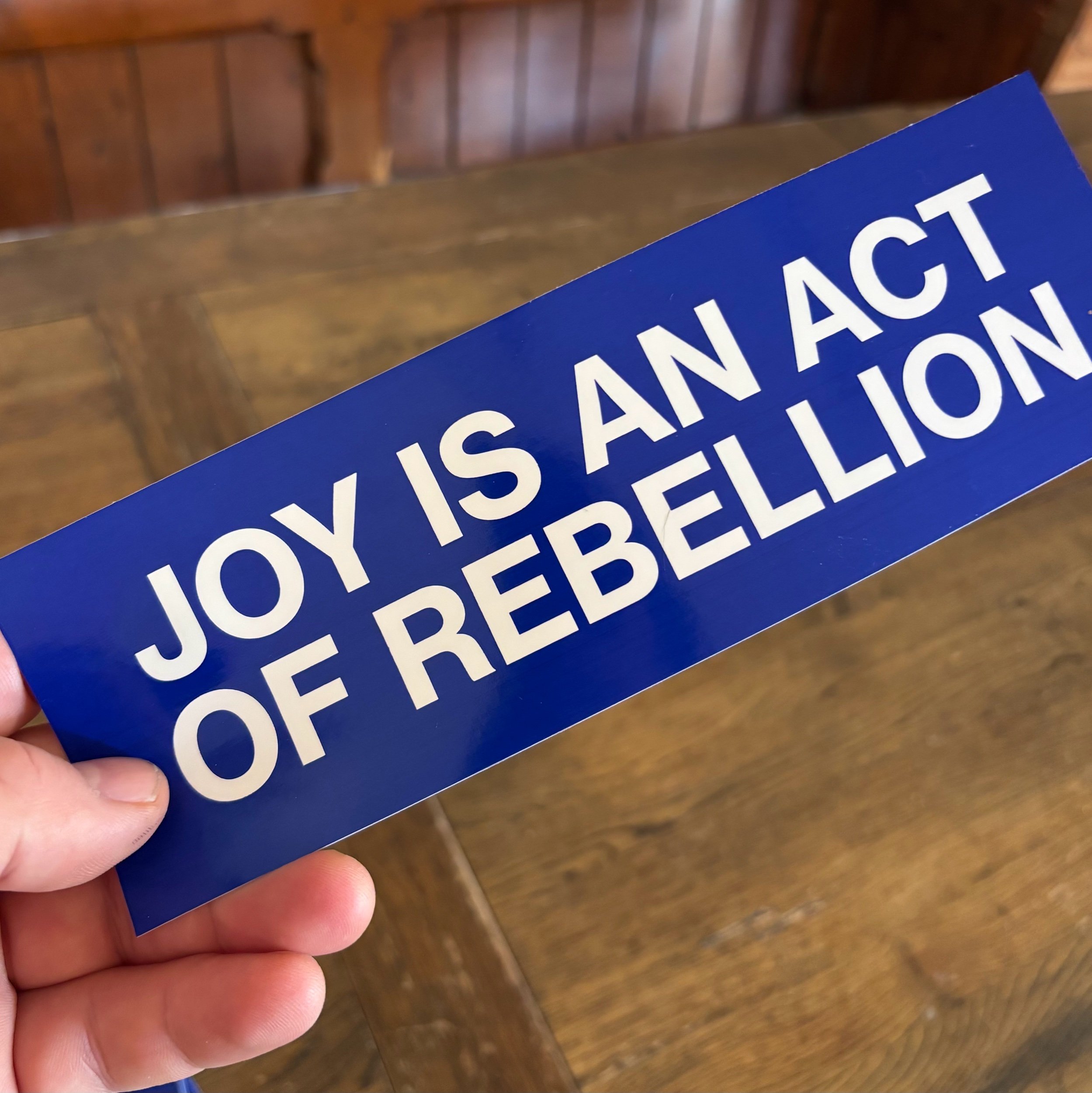 Image 1 of 2 Image 2 of 2 Joy is an Act of Rebellion Sticker - BLUE from $4.00 8x2.5” bumper sticker on good quality vinyl. Suitable for outdoor and indoor use. Number: Select Number 1 5 Get notified by email when this product is in stock. Quantity: Add To Cart Added! 8x2.5” bumper sticker on good quality vinyl. Suitable for outdoor and indoor use.
